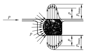 由于預(yù)密封作用,O形圈與被密封光滑面和溝槽底面緊密接觸,這樣當(dāng)流體通過間隙進(jìn)入溝槽時,只能對O形圈的一側(cè)面起作用。在工作狀態(tài)下,流體通過間隙加到O形圈一側(cè)的內(nèi)壓力進(jìn)一步加大時,把O形圈推向溝槽另一側(cè)面而擠壓變形成D形狀態(tài),并把這種壓力傳遞到密封接觸表面。因此,由于最初的過盈壓力作用,密封壓力實際上大于所施加的流體壓力。O形圈工作狀態(tài)下接觸面的壓力分布如圖3所示。