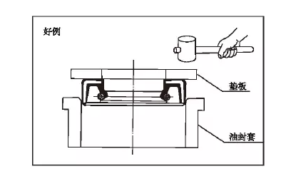 油封裝入時原則上應(yīng)使用壓力機,在不得已的情況下,使用鐵錘時,必須利用安裝專用工具或墊板等物,使油封垂直的進入。另外不能直接敲擊油封。