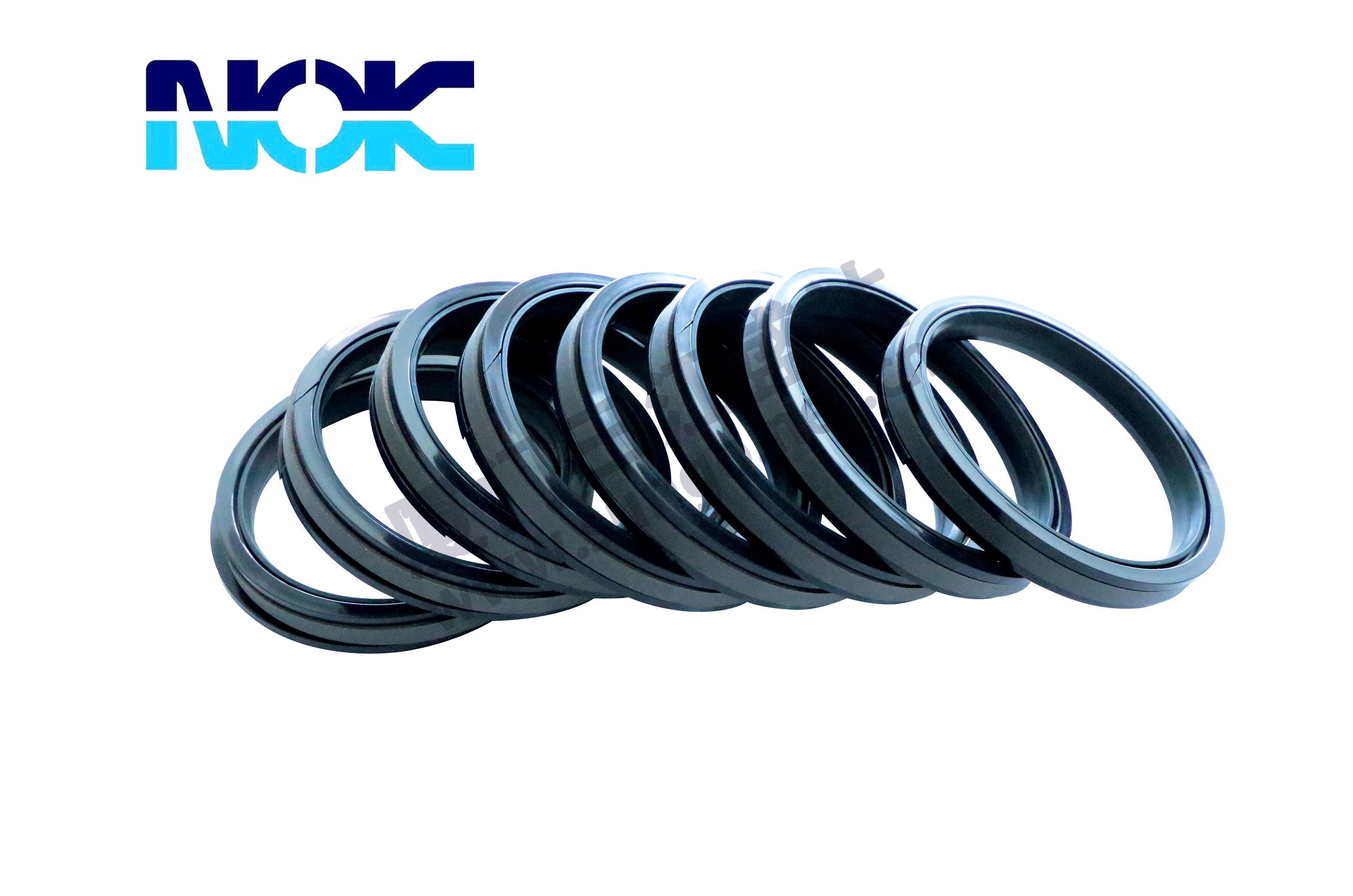 NOK密封滑環(huán)材料是用性能極為好的復(fù)合材料,作為液壓密封件,其承壓能力高達(dá)50Mpa,瞬時承壓可達(dá)100MPa,對于活塞由于換向和進(jìn)人緩沖區(qū)域所承受的高壓沖擊完全可以承受;NOK密封件的設(shè)計(jì),針對挖掘機(jī)維修市場普遍的密封件使用壽命短的現(xiàn)象,適當(dāng)了增加了過盈量,提高了密封效果,延長使用壽命,并且NOK有著獨(dú)特的泄壓油槽的功能的設(shè)計(jì),緩沖減壓更好,背壓更舒服,搭配NOK的HBY緩沖環(huán),DKBI的防塵效果更佳。這兩者設(shè)計(jì),更好的緩解活塞桿的壓力。