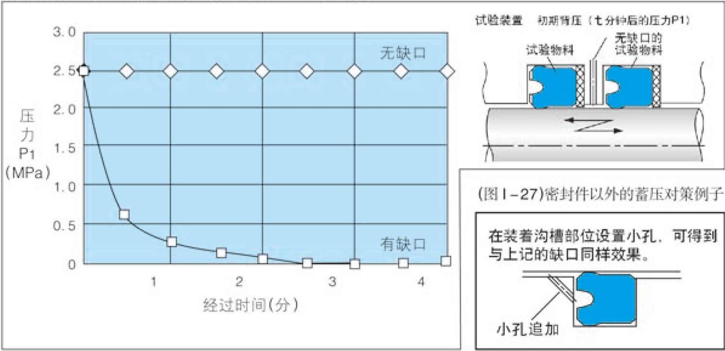 為此,NOK公司針對(duì)性的通過(guò)大數(shù)據(jù)實(shí)驗(yàn),來(lái)對(duì)比了有無(wú)缺口的所影響背壓泄露性能的差別。(NOK2010版密封件選型書P231)