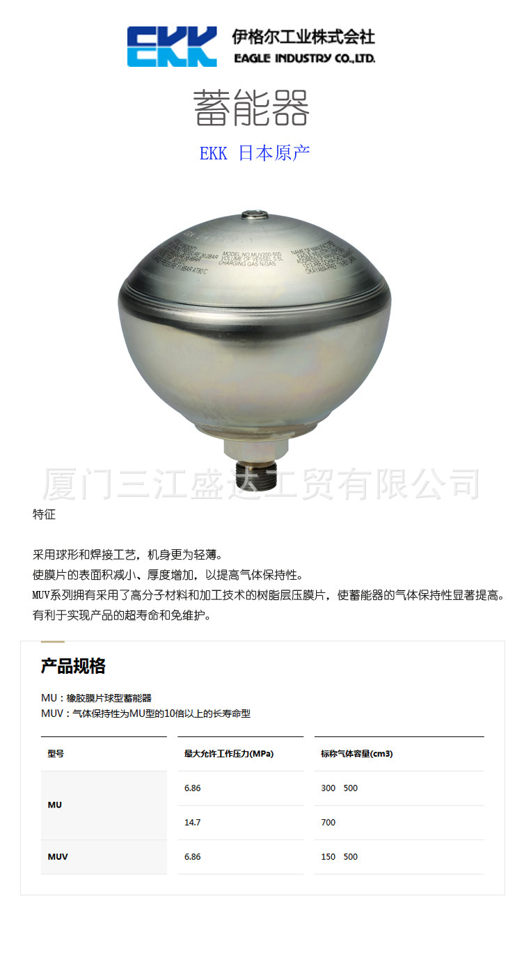 小容量球型輕量隔膜式蓄能器MU,MUV